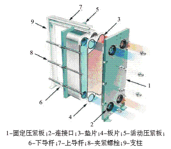 板式换热器的主要部件:传热板片、密封垫圈、前后端板、定位螺栓、压紧装置、轴、接口管、垫片等。常见的传热板片有:人字形板、水平平直波纹板、锯齿形板。无论哪种板片,它们都具有:强化传热的凹凸形波纹、板片四周及角孔处的密封槽、流体的进出口以及悬挂用的缺口。